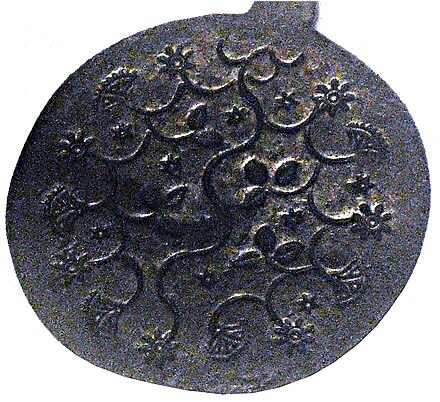 Round metal plate decorated with raised pattern of flowers, vines, and leaves Detail of a Belgian moule à oublie Waffles are preceded, in the early Middle Ages, around the period of the 9th–10th centuries, with the simultaneous emergence of fer à hosties / hostieijzers (communion wafer irons) and moule à oublies (wafer irons). While the communion wafer irons typically depicted imagery of Jesus and his crucifixion, the moule à oublies featured more trivial Biblical scenes or simple, emblematic designs. The format of the iron itself was almost always round and considerably larger than those used for communion.